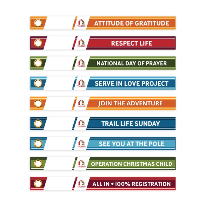 Showcase your troop’s involvement in Trail Life USA campaigns with Campaign Participation Ribbons! These ribbons are designed to attach easily to your Troop flag pole and honor your Troop’s participation in Annual Campaigns. Instead of annual discs, a new pin with a screw-on back is attached in the white space of theĀ ribbonĀ each year to allow your Troop to proudly display up to eight years of participation on a singleĀ ribbon.